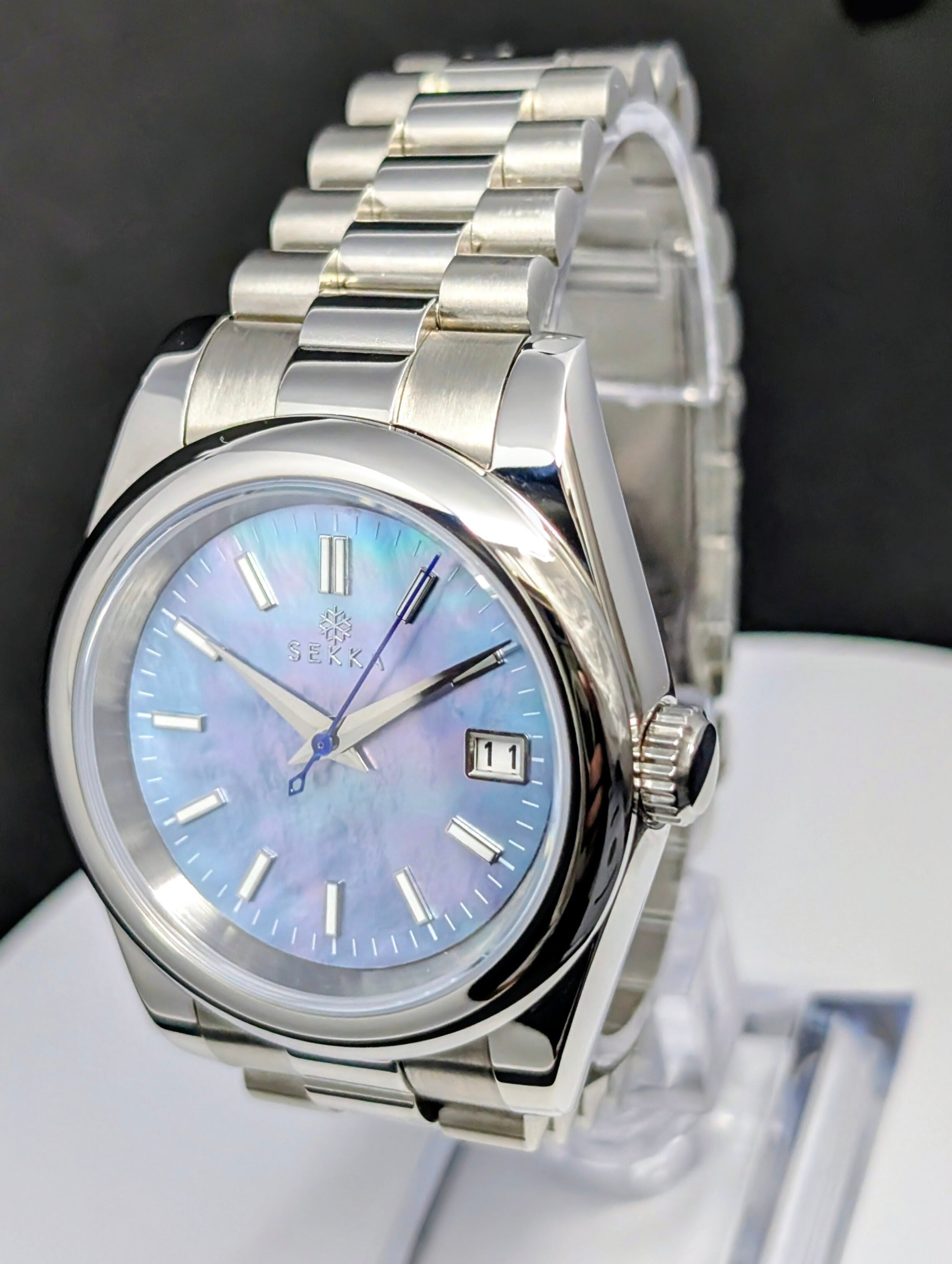 36mmのコンパクトなケースに、角度で表情を変えるシェル調ダイヤルを採用。