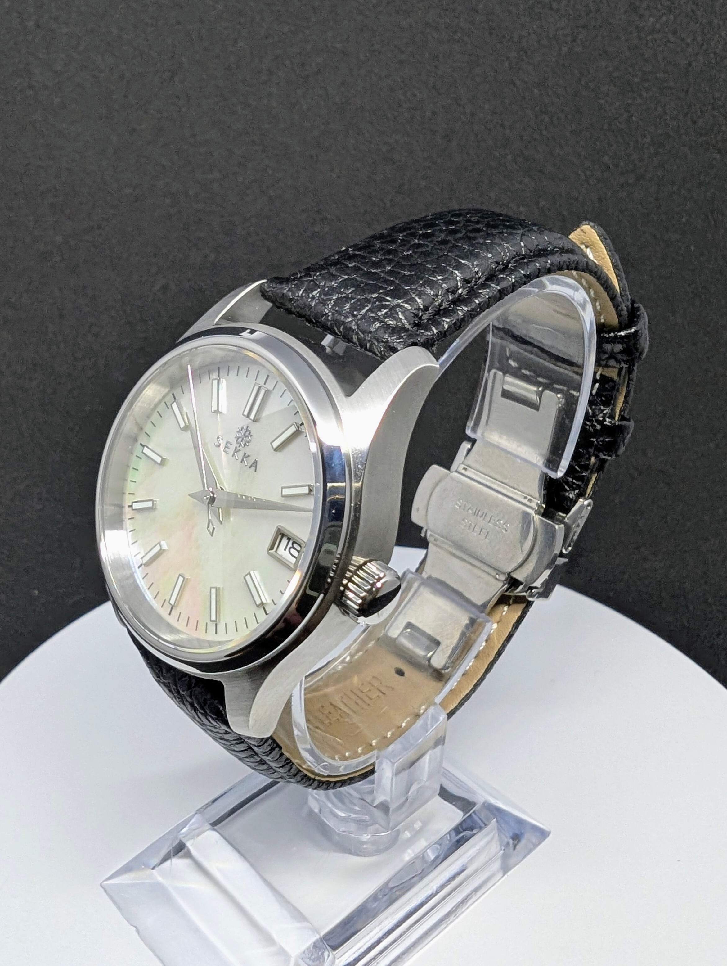 36mmのコンパクトなケースに、角度で表情を変えるシェル調ダイヤルを採用。
